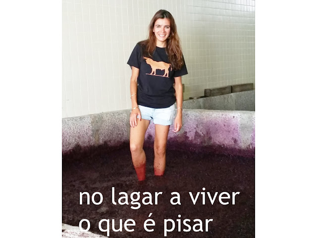 O almoço foi servido numa outra quinta, onde fomos recebidos como se fossemos da casa. Sentados, e com uma mesa bem recheada de comida e bebida apreciávamos a vista (vinhas, muitas vinhas!) enquanto íamos falando muito alegremente do que se seguiria – a entrada no lagar para pisar uvas -. Sim, este seria o momento do dia. Já o tinha feito, mas não o fazia há mais de 20 anos. Estava tão ou mais excitada como os que o iriam fazer pela primeira vez. Foi uma ‘lagarada’ em que pisamos, dançamos, cantamos, rimos e divertimo-nos, divertimo-nos muito (afinal estávamos na versão turista). Tudo, na companhia de um guia animado e conhecedor da região, que ia partilhando histórias da vinha, do vinho e das suas gentes.