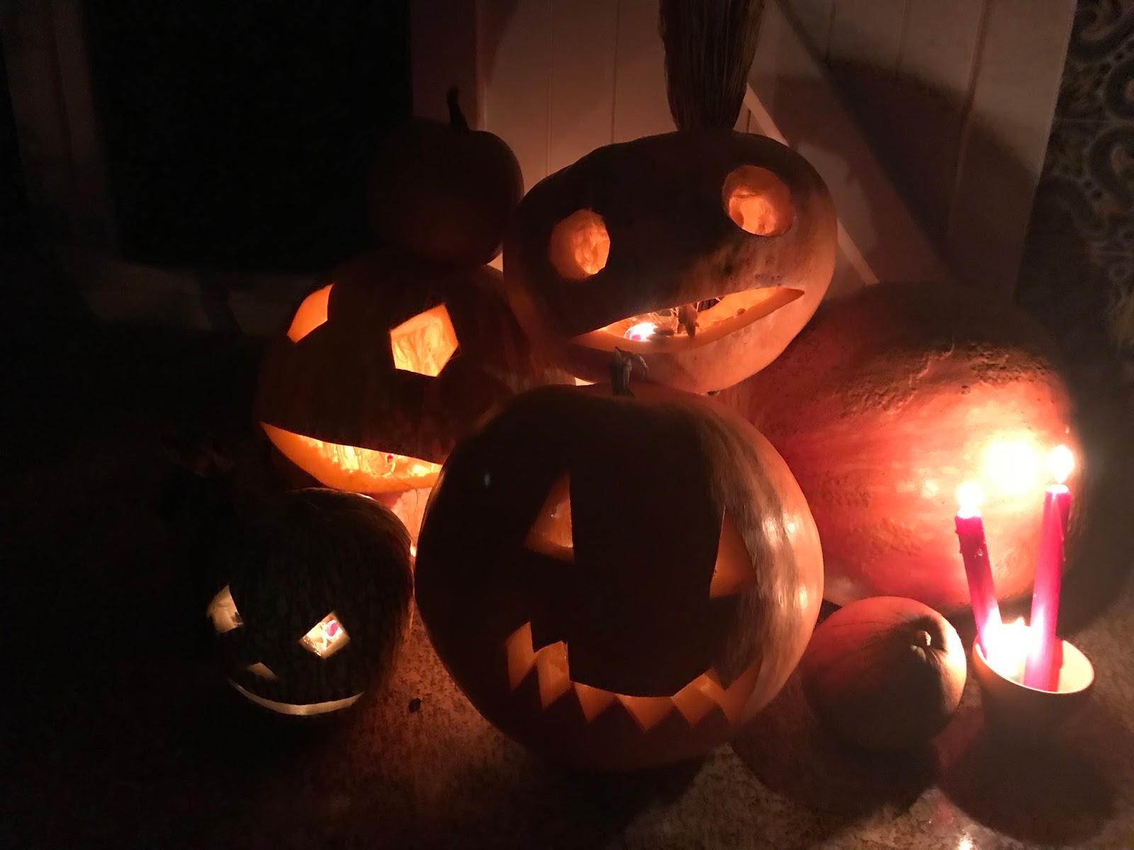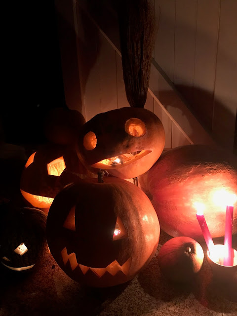 Este ano celebrei o Halloween em casa. Temos várias abóboras no quintal (isto de viver no campo tem destas coisas), e este ano foi especialmente produtivo, portanto foi só juntar algumas delas na entrada principal e prepara-las para servirem de ‘candeeiro místico’. Fiz-lhes umas aberturas para desenhar os olhos e a boca, e uma abertura para poder incorporar as velas. Várias velas. Depois foi esperar que a noite chegasse para as acender.