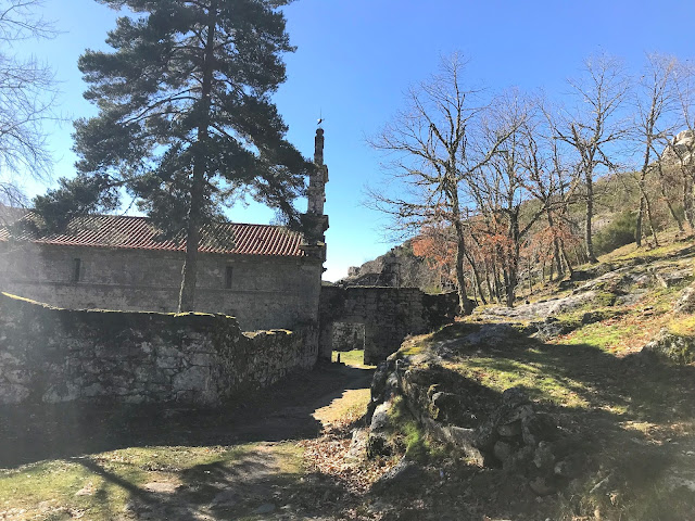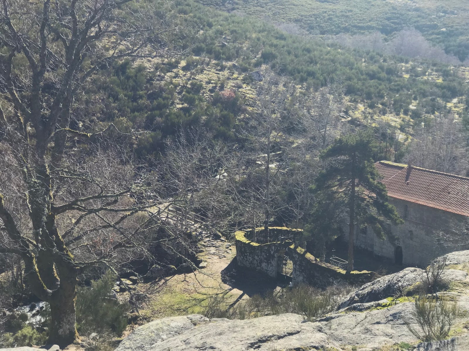Cheguei a pensar que poderia não existir mosteiro (risos), ou que não o conseguiria encontrar. Estava de facto muito isolado, e a última parte do percurso é pedonal, não é curta e é em cima de lajes de vários tamanhos que se vão intercalando uns nos outros de forma acentuada, em declive, com passagens estreitas de águas de riachos ou nascentes vizinhas. De cima comecei a avistar o mosteiro, num fundo paisagístico espetacular!