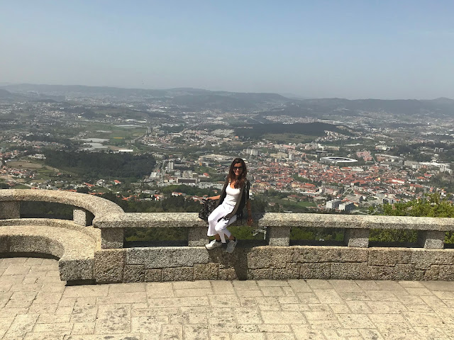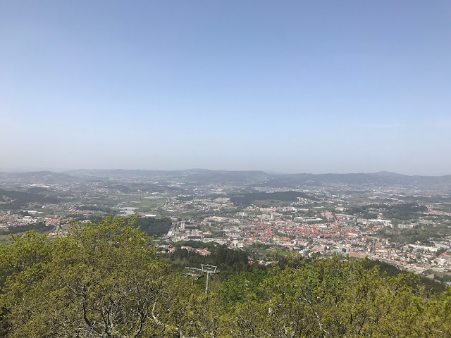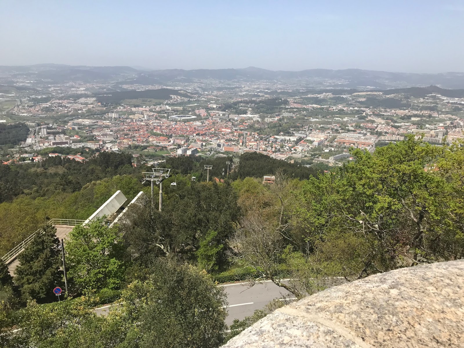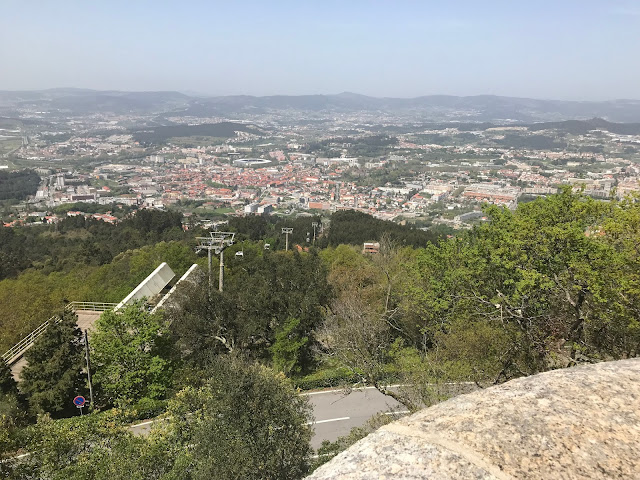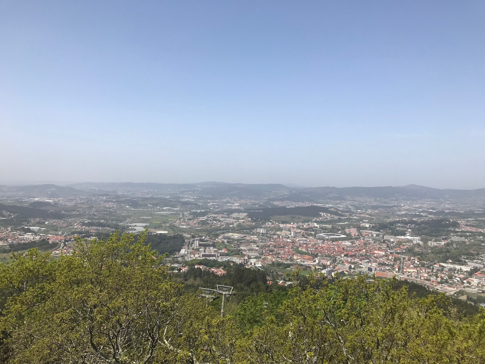 Contornei o santuário e parei nas traseiras, no miradouro. O motivo de estar ali. E de lá, uma vista fabulosa, ampla, para a cidade e para as redondezas, numa área vastíssima. Tudo, quase tudo, estava fácil de identificar na cidade. Os pontos principais, os mais populares, viam-se claramente, e pareciam próximos. Ali, a dois passos do miradouro. E a dois passos estava também o teleférico, que transporta turistas, curiosos e aventureiros (risos), da cidade até ao Monte da Penha, numa ‘viagem pelos ares’. E numa próxima, é nesta viagem que quero ir, pelos ares da Penha …